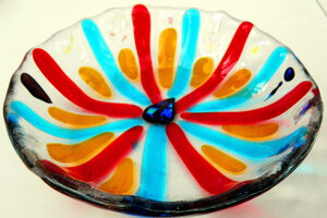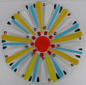 2023Mooie ronde schaal met inleg van irriserende stukjes glas en bloemmotiief.